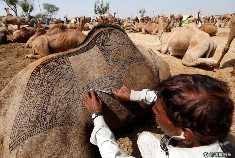 在宰牲節前夕(Eid al-Adha festival),一名男子用剪刀在駱駝的身上雕出繁複地花樣,準備把牠帶到為宰牲節而設立的臨時牛市展示。