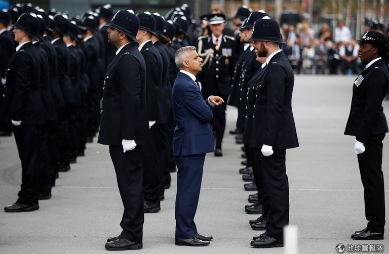 在倫敦警察學院(Metropolitan Police Academy)的結業典禮上,倫敦市長沙迪克汗(Sadiq Khan)和即將成為警察的畢業生談話。