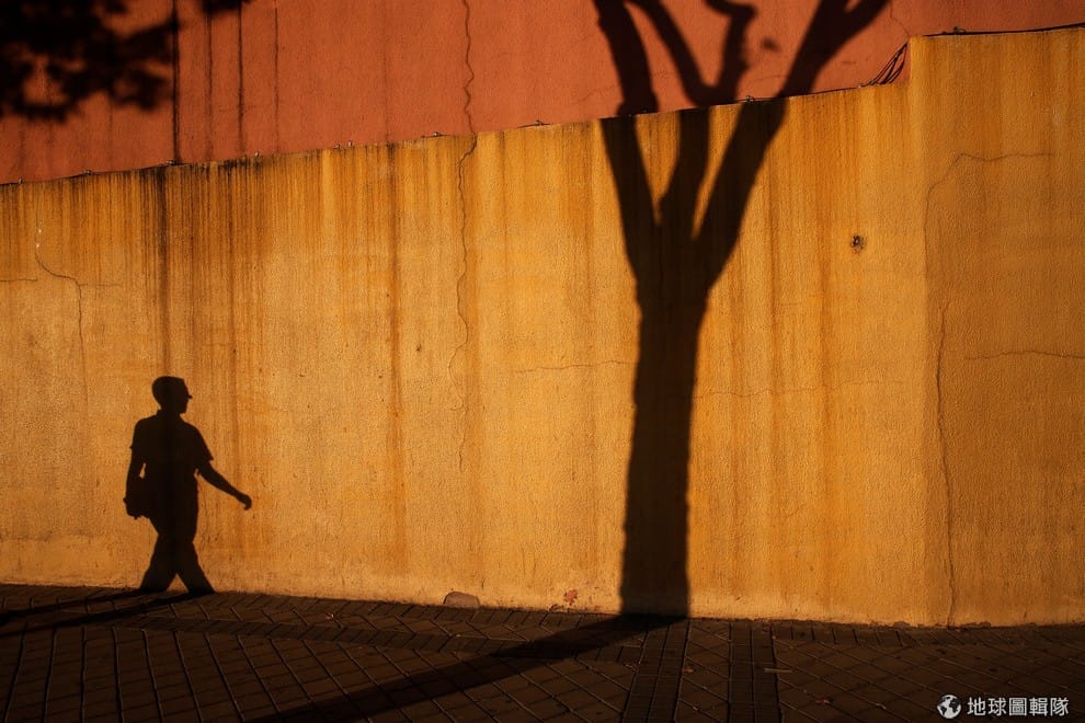 一名行走中的男子與樹木映照在西班牙馬德里(Madrid)的一道牆上。