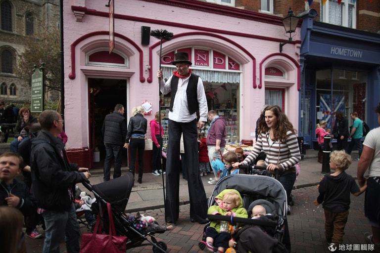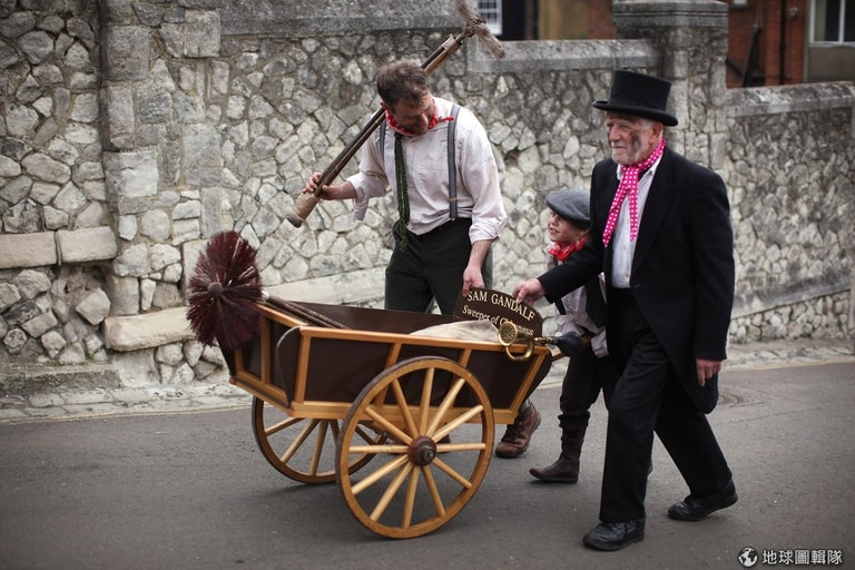 每年5月初,就是英國羅徹斯特鎮的大節日「掃煙囪節」(Chimney Sweeps Festival),這天一到,街頭上滿是五顏六色裝扮的居民,他們唯一共通點就是塗黑的臉、或是手上長長的刷子!