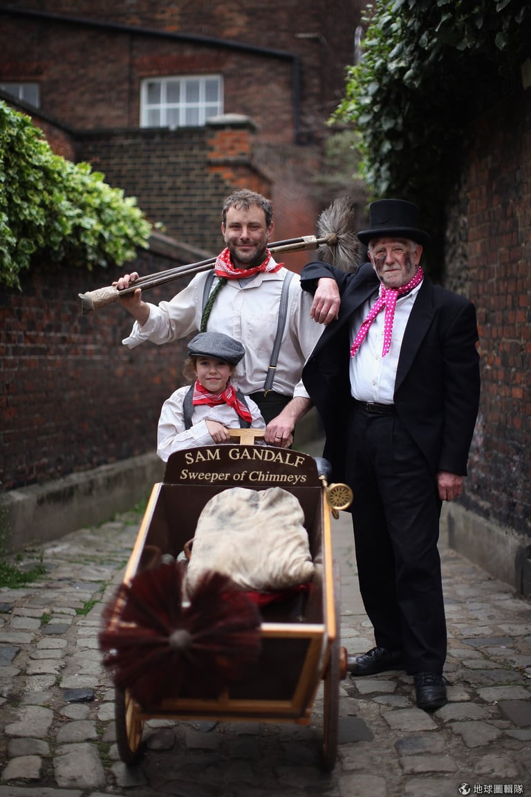 早年法規限制下,彎彎曲曲的煙囪管線頂多只有23-36公分寬,一般大人根本無法進入,於是就出現了掃煙囪孩子團隊,這些孩子接受「煙囪大人」(Master sweep)的訓練和指派,在一個個可能害他們致癌、悶死、或是燒死的煙囪中工作、賺取微薄薪資。每年僅5月1號這天,孩子們才能休假順便慶祝春天到來。