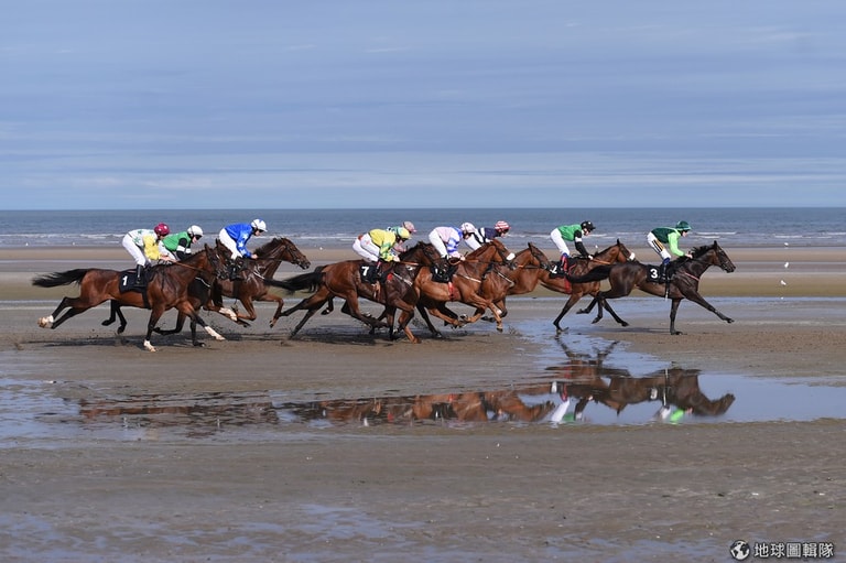 一群騎士駕著賽馬,飛奔過位於萊敦村(Laytown)的海灘。