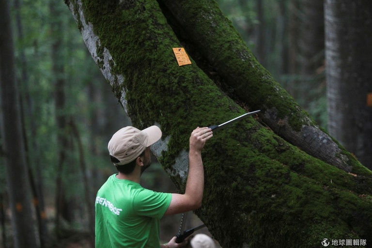一名綠色和平組織(Greenpeace)的義工,專心地測量樹木的樹圍,這裡是羅馬尼亞境內的一座處女林,生態非常豐富。