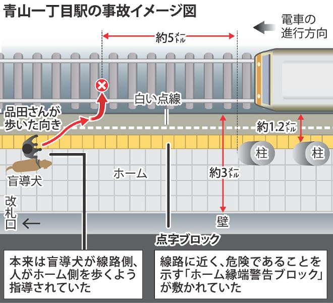 路透社死亡的品田直人在車站附近上班,回家途中遭遇意外。該車站有鋪設導盲磚,但未設置月台閘門。監視器顯示品田走在月台導盲磚上,逐漸偏向鐵軌,站務員察覺後透過麥克風提醒:「請退後。」但右手握著導盲鞍的品田此時左腳踩空跌落,被約兩秒後進站的電車輾斃,留下4歲的母拉不拉多犬「華芙」在月台上不知所措。