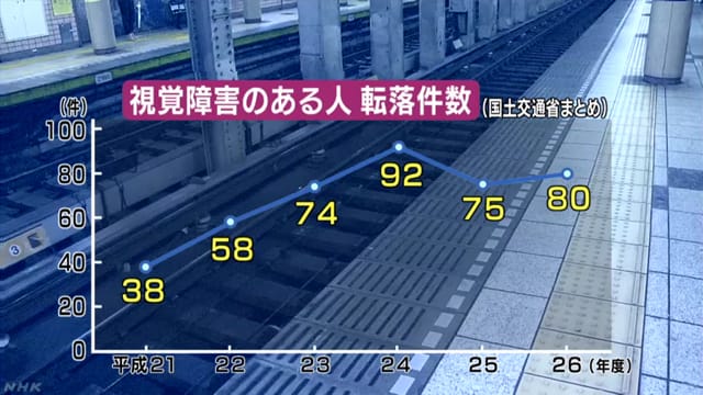 合作夥伴根據國土交通省的資料,2009年度有38起視障者落軌意外,之後一路飆升,2012年更達92起,2014年也有80起。 取自:NHK