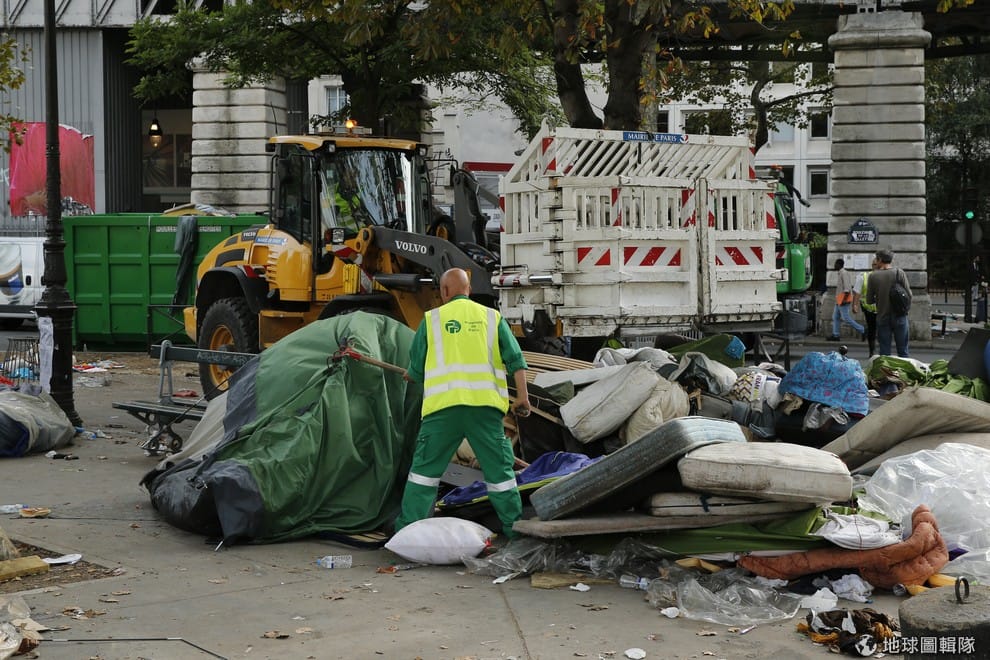 清潔隊員把難民用的帳篷和床墊清除乾淨,這裡鄰近巴黎史達林格勒(Stalingrad)地鐵站,有不少流浪到巴黎的難民選擇在這裡扎營。