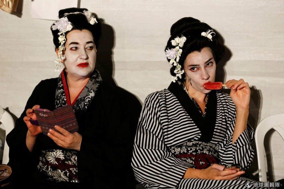 在特拉維夫(Tel Aviv)的露天公園,以色列歌劇院的演員在後台吃冰滑手機,準備上場演繹義大利作曲家普契尼(Giacomo Puccini)的作品《蝴蝶夫人》(Madama Butterfly)。