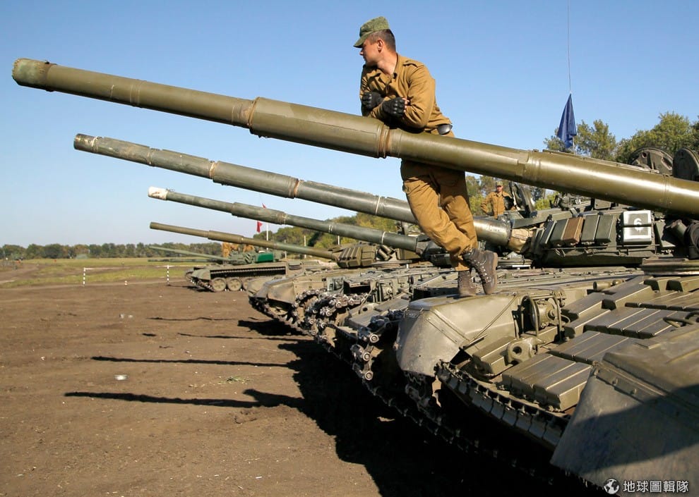 一名軍人站在坦克上準備比賽,他所在的位置是自行宣布獨立的「頓內次克人民共和國」(Donetsk People's Republic)。