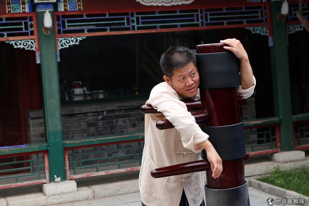 在北京的功夫禪學院,一名武術大師趴在練習用的木樁上休息。