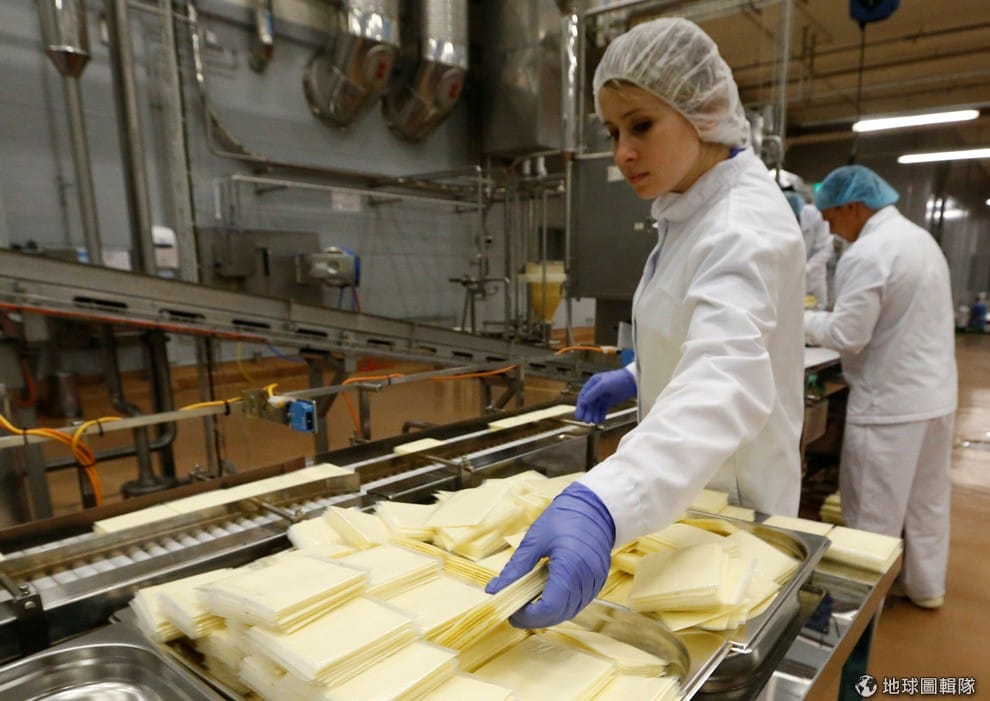 在莫斯科郊外的起司工廠,工作人員動手整理一片片的起司準備包裝。
