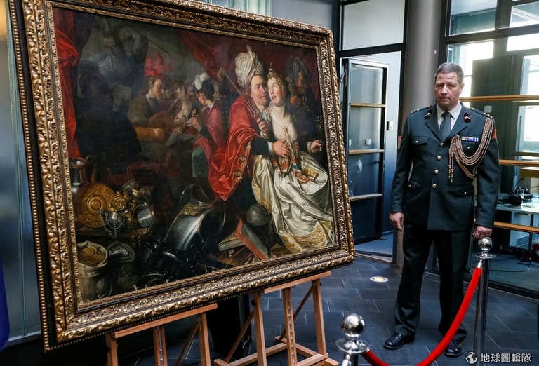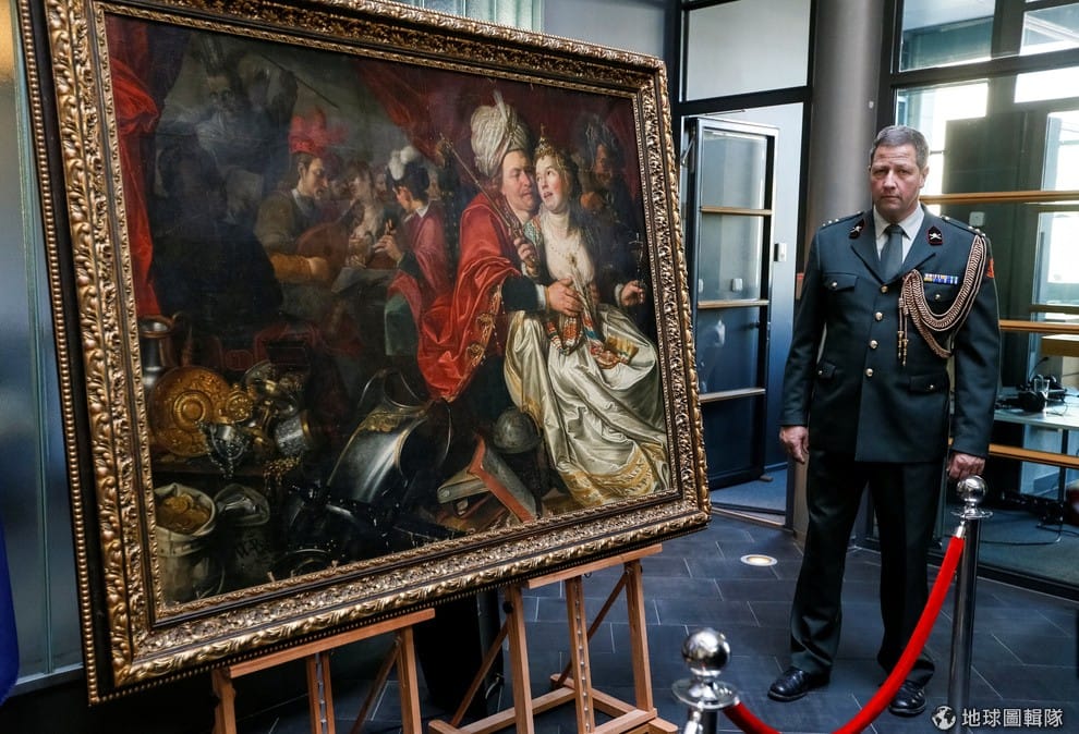 一名警衛在首都基輔看守畫作,這幅畫作在 2005年的時候被人從荷蘭西弗里蘭博物館(Westfries Museum)偷走,近日才在烏克蘭被尋獲。圖中的畫作是 17世紀畫家瓦本(Jacob Waben)的名作《浮華世界》(Vanity)。