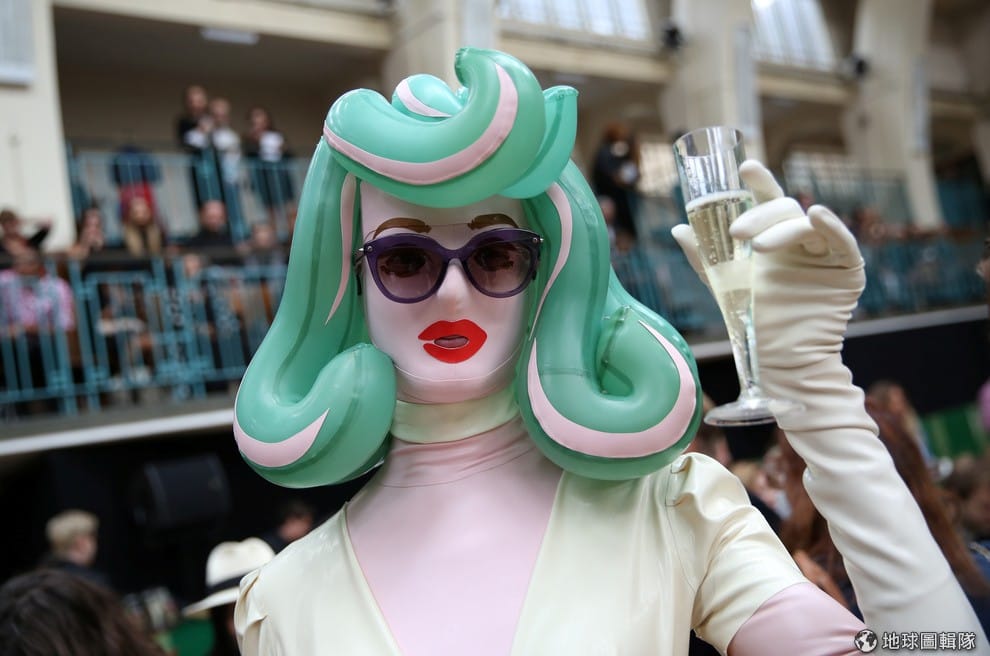 一名參加倫敦時裝周的女子,穿上特殊設計的服飾,拿起一杯香檳在鏡頭前留影。
