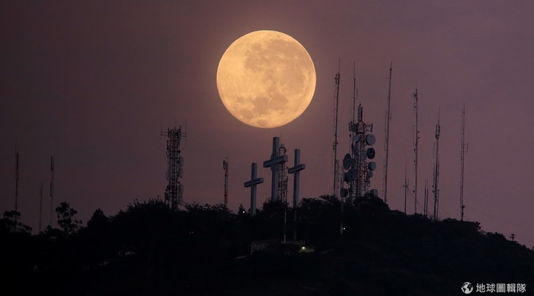 一輪明月高掛天空,照亮了山丘上的三座大型十字架。