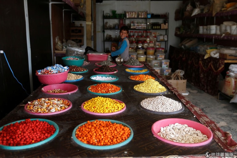 一名敘利亞難民男孩和他的父親在豆子店工作,這裡是約旦西北部馬弗拉克(Mafraq)的難民營,五顏六色的豆子排在桌上,等著顧客上門。
