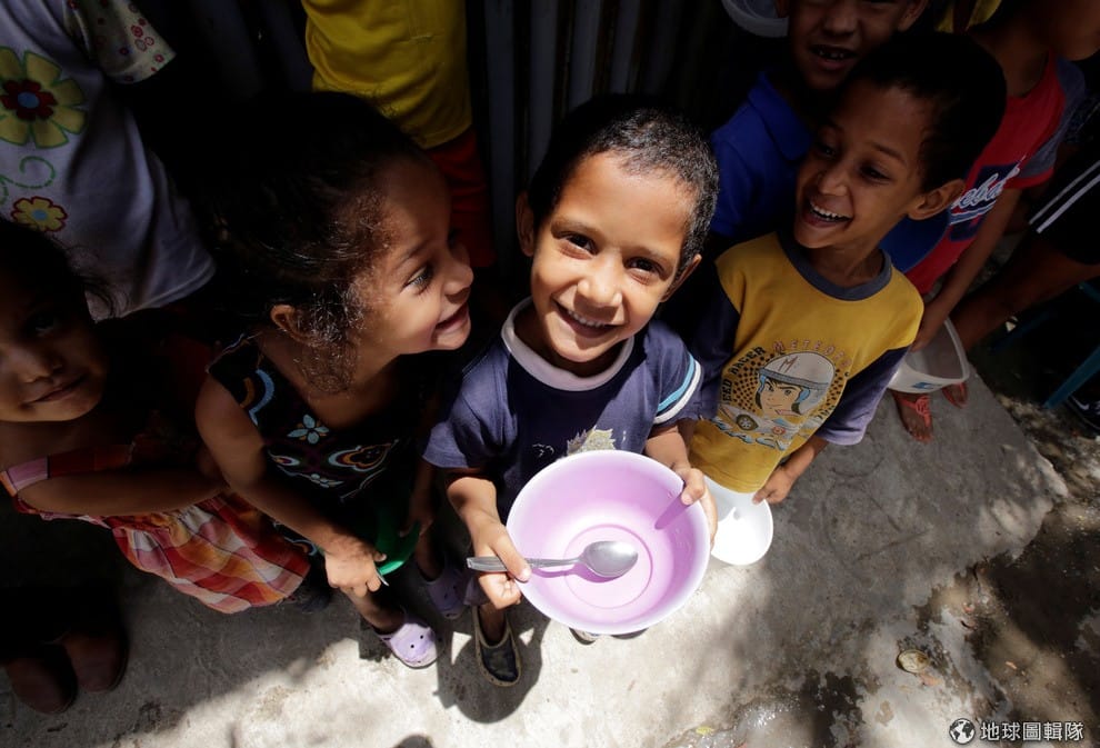 在首都卡拉卡斯(Caracas)的低收入社區,孩子們手拿飯碗排成一列,等待義工提供的免費餐點。