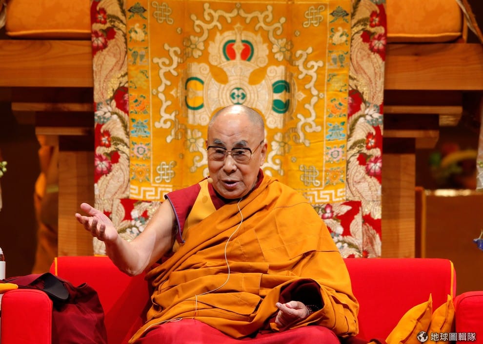 西藏流亡精神領袖達賴喇嘛對著台下聽眾演講。