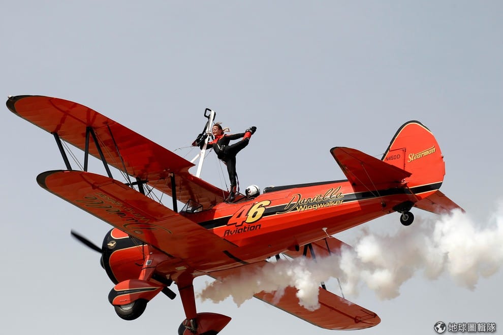 在雅典北方的空軍基地,一名女特技演員在紅色的飛機上展現身體的力與美,這個星期是雅典的飛航周,當地會舉辦大大小小的飛航活動,吸引全球的目光。