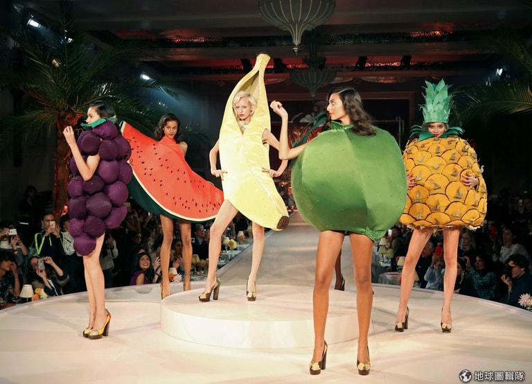 模特兒們將自己打扮成各式各樣的水果,走上伸展台展示女鞋設計師奧林匹亞(Charlotte Olympia)的作品。