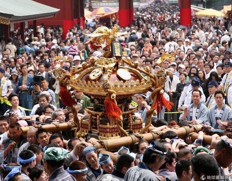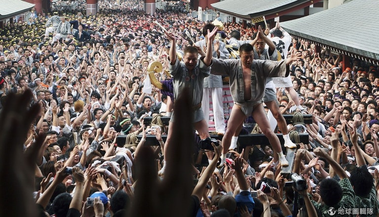 星期日是三社祭的重頭戲,3座主神轎加入遊行,每個主神轎都重達一噸,需要50幾人才能扛起。主神轎早上6點從淺草神社出發,走遍主要幹道,最後在晚上8點的時候回到淺草神社,遊行時間長達14小時。Koichi Kamoshida/Getty Images