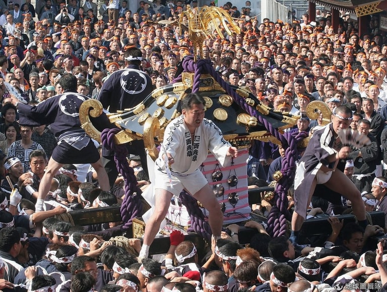 男人站在神轎上吹哨子、拍手,指揮抬轎子的節奏。由於轎子會劇烈晃動,站在上面的人要有很好的平衡感。Koichi Kamoshida/Getty Images