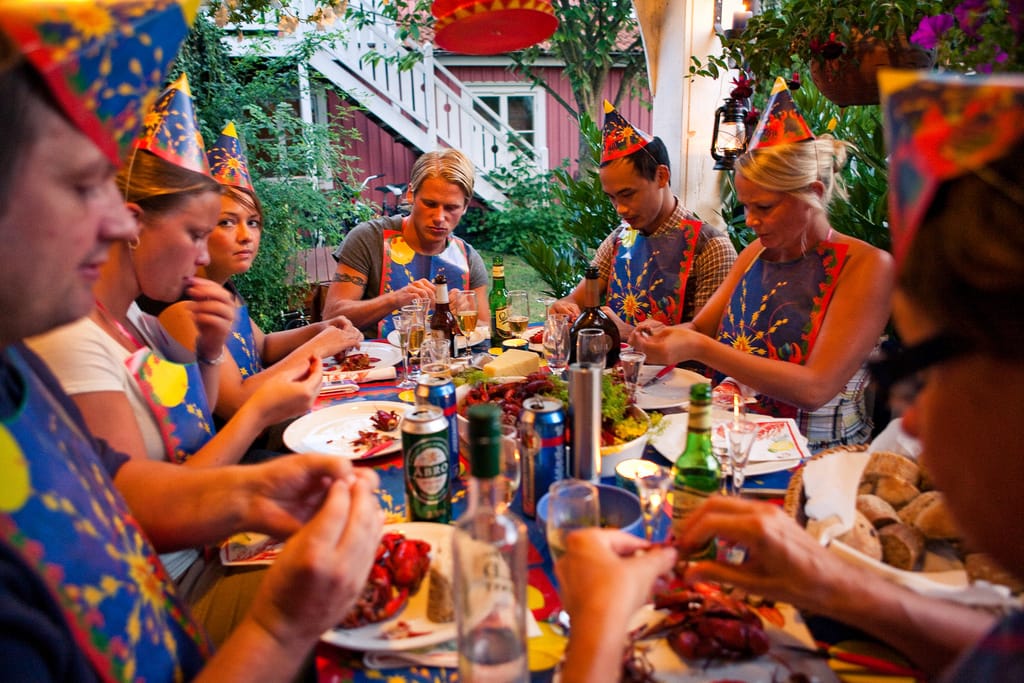 此時,家家戶戶開始準備舉辦盛大的小龍蝦戶外餐會慶典。瑞典人通常是一口小龍蝦,配上一口烈酒,興致一來還哼唱飲酒歌,好不熱鬧。其他搭配的食物還包括法國麵包、瑞典硬麵包片、辣起司和其他海鮮類。人們也會和傳統慶典食物一起食用, 包括牛肉丸、鯡魚、夏季馬鈴薯和鹹派等等。對瑞典人來說,再多的食物也不為過,這是一個充滿歡樂和可以趁機放肆飲酒的美好夏日。