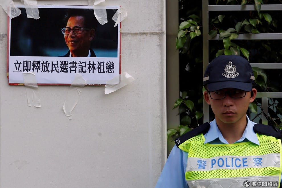 路透社在香港中聯辦(中央人民政府駐香港特別行政區聯絡辦公室)外面,聲援林祖戀的標語被貼在牆上。