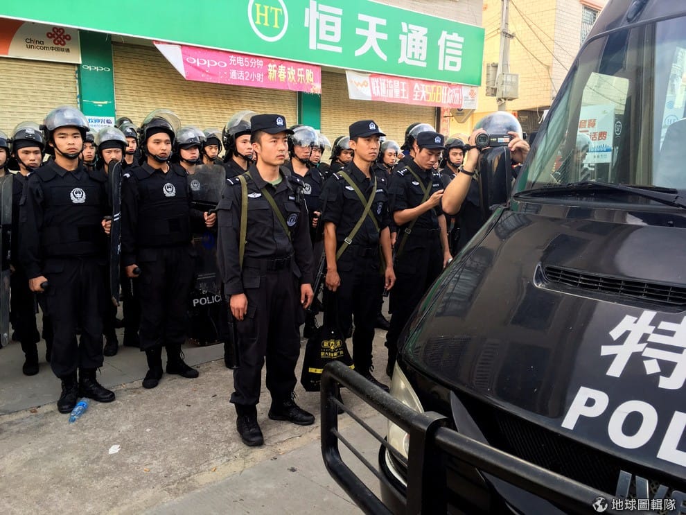 照片為今年 6月在烏坎村巡邏的警察。在上周三,警察也全面封鎖了烏坎村。