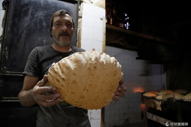 一名男子手上拿著當局的烘焙坊烤出來的麵包。隨著內戰已經邁入第五年,敘利亞人盡力維持日常生活,除了在破敗的街區維生外,也把握每一天珍惜沒有砲火的日子。