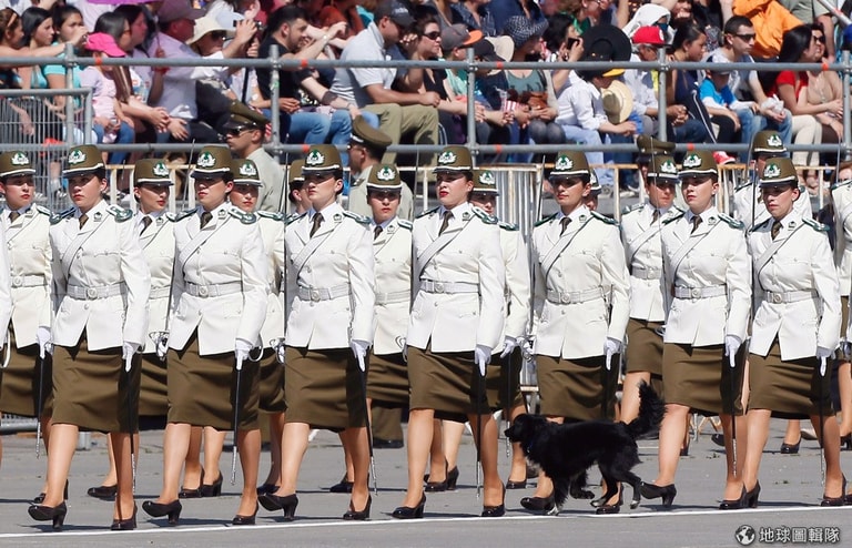 19號這天,是智利一年一度的閱兵大典,一群穿戴整齊的女子踢著正步,走過參加民眾的面前。