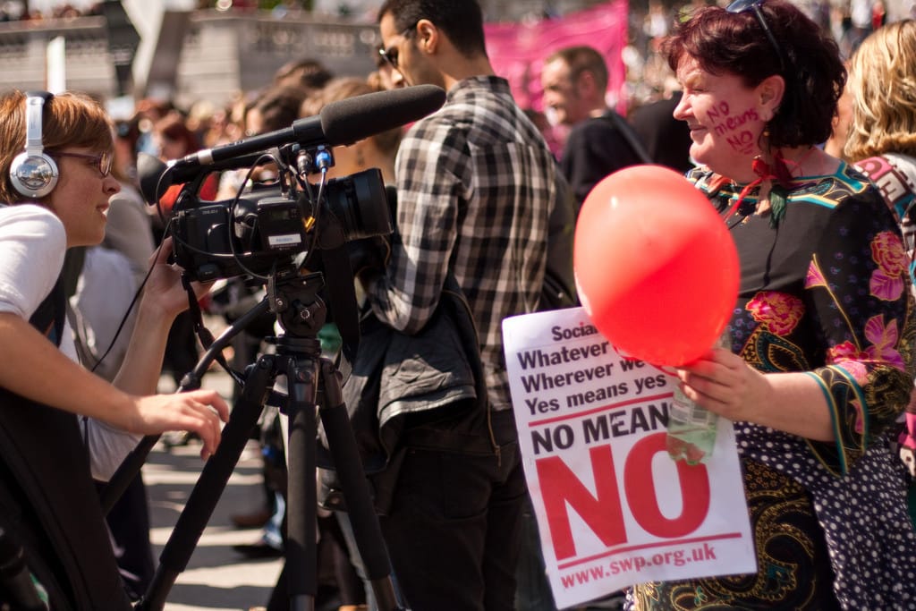 在 2011年倫敦的「蕩婦遊行」(Slutwalk meeting),一名遊行者手拿著「不要就是不要」的標語。