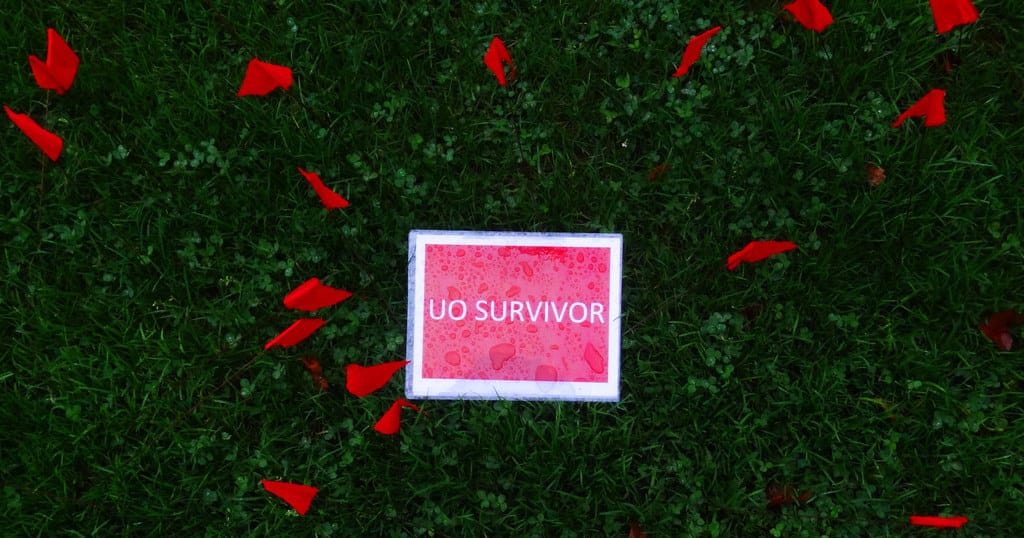 美國奧勒岡大學(University of Oregon)在 2014年舉辦性暴力生還者遊行,參與者紛紛將旗子插在草地上,表達自己也是生還者之一。