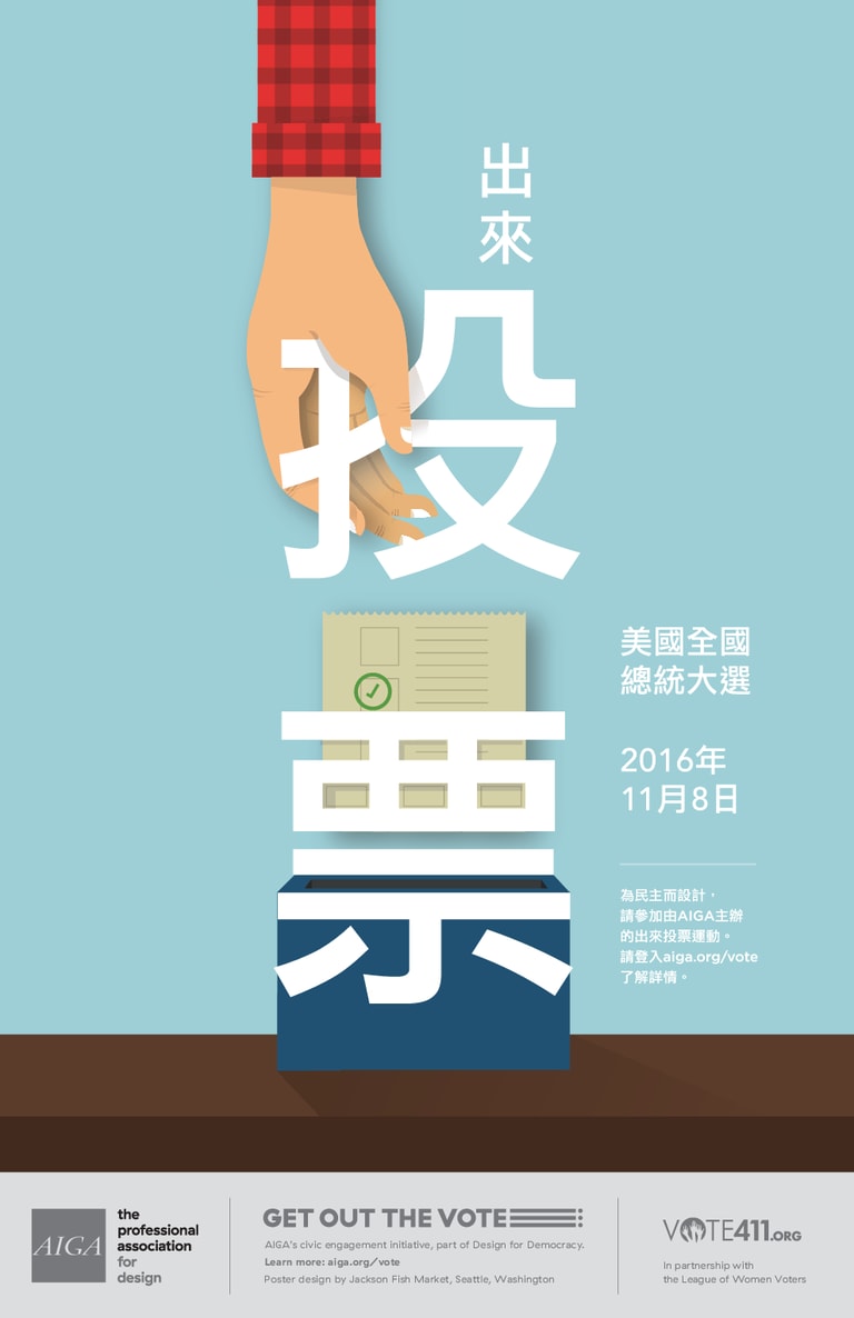 AIGA的催票海報設計活動,今年也與無黨無派的美國女性選民聯盟(the League of Women Voters, LMV)合作,鼓勵更多女性出來投票。此外,AIGA設計師也瞄準少數族群,用他們的文字設計出催票海報。接下來,就讓我們一起來欣賞設計師包含在海報中的訊息吧!