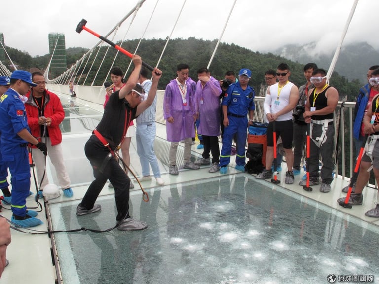 為了證明這座透明大橋夠安全,當局還找來大錘讓人猛力攻擊透明吊橋,他們也找來車輛上橋測試,一再保證吊橋的安全。然而,這座吊橋因為安全維護的關係,目前並沒有對遊客開放。