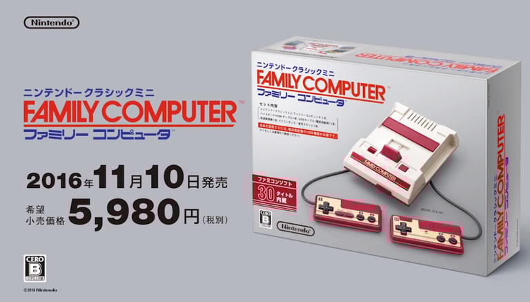 此外值得一提的或許是雖然採用 HDMI 端子輸出,但是為了滿足懷舊玩家的情感,還特地提供了模擬了傳統電視映像管掃描線的影像模式,當然還有其他不同的濾鏡和顯示模式,連外盒包裝都復原了原始的設計,Nintendo Classic Mini Family Computer 預定於 2016 年 11 月 10 日發售,定價日幣 5980 元(未稅)。