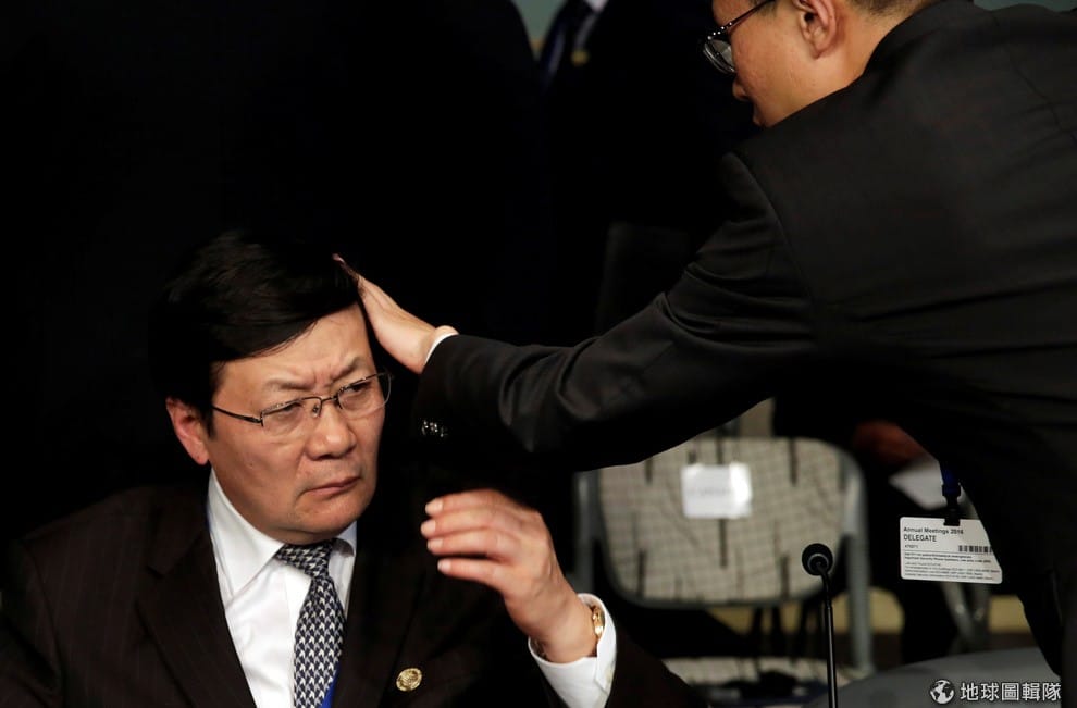 在國際貨幣基金組織(IMF)和世界銀行(World Bank)的年會上,一名工作人員在開會前幫中國財政部長樓繼偉調整頭髮。