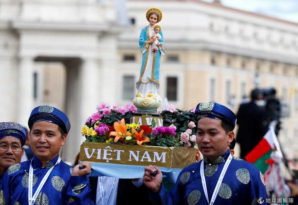 在羅馬天主教宗方濟各(Pope Francis)帶領的聖母禱告下,各國天主教徒扛著他們的聖母走過聖彼得廣場,場面壯觀隆重。圖為來自越南的隊伍與他們的聖母。