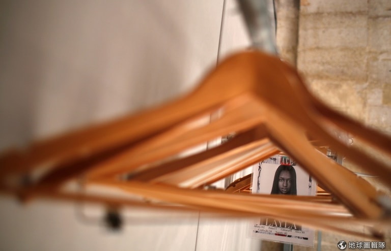 在時裝秀的後台,一張模特兒的照片和衣架吊在空空的欄杆上。