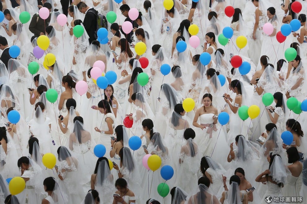 在婚紗市場上,每個女子身穿白色婚紗手拿氣球,準備打破最多人一起穿婚紗的金氏世界紀錄。