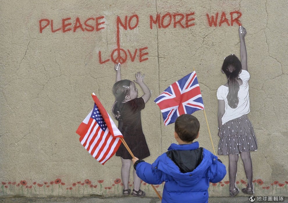 在諾曼地海灘旁,小男孩拿著美國、加拿大、英國的國旗,看著一個寫有「不要再有戰爭,和平。」的壁畫。