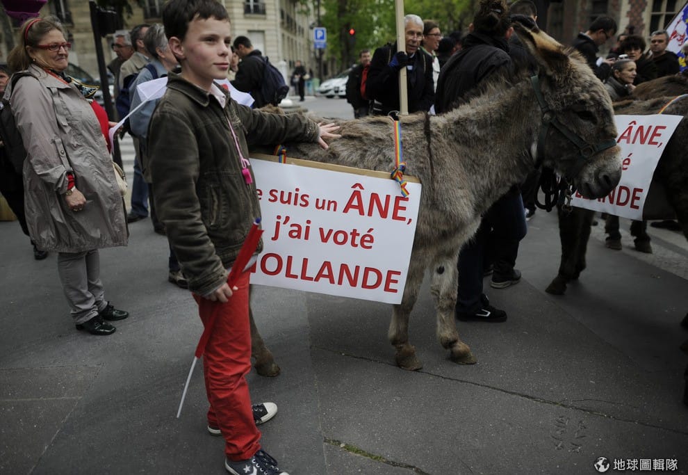 gettyimages反對同性婚姻的團體中,有人高舉標語抗議政府讓同性婚姻合法化,甚至也有民眾牽著驢子並拿著牌子寫「我是隻驢,因為我投票給歐蘭德」藉此表達對法國總統法蘭索瓦‧歐蘭德(François Hollande)的憤怒。FRED DUFOUR/AFP/Getty Images