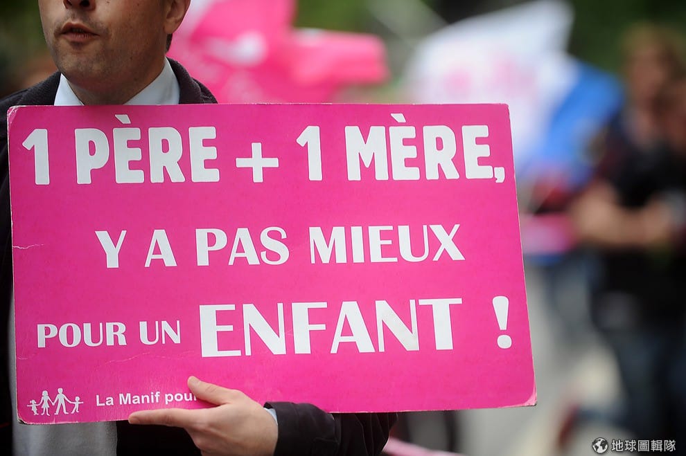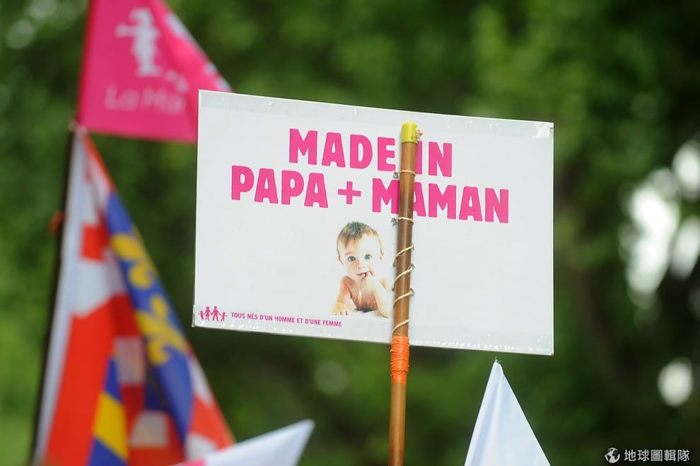 反對同志婚姻的團體認為家庭的組成要有爸爸和媽媽才完整,不滿同志婚姻的合法性。照片中的標語寫著「爸爸+媽媽製造」。Antoine Antoniol/Getty Images