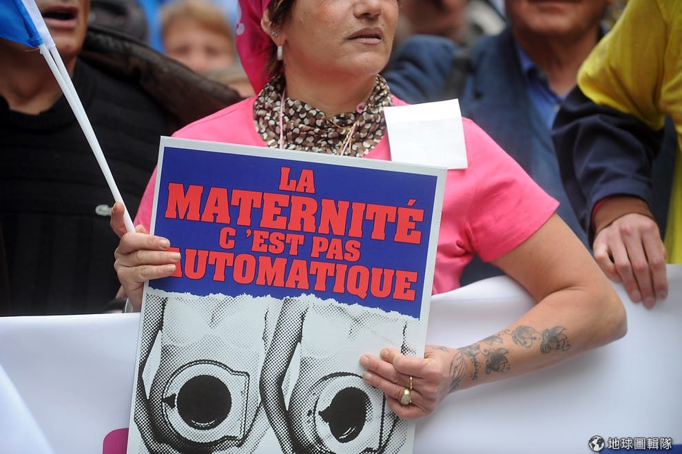 寫著「懷孕生小孩不是機器」的標語。Antoine Antoniol/Getty Images