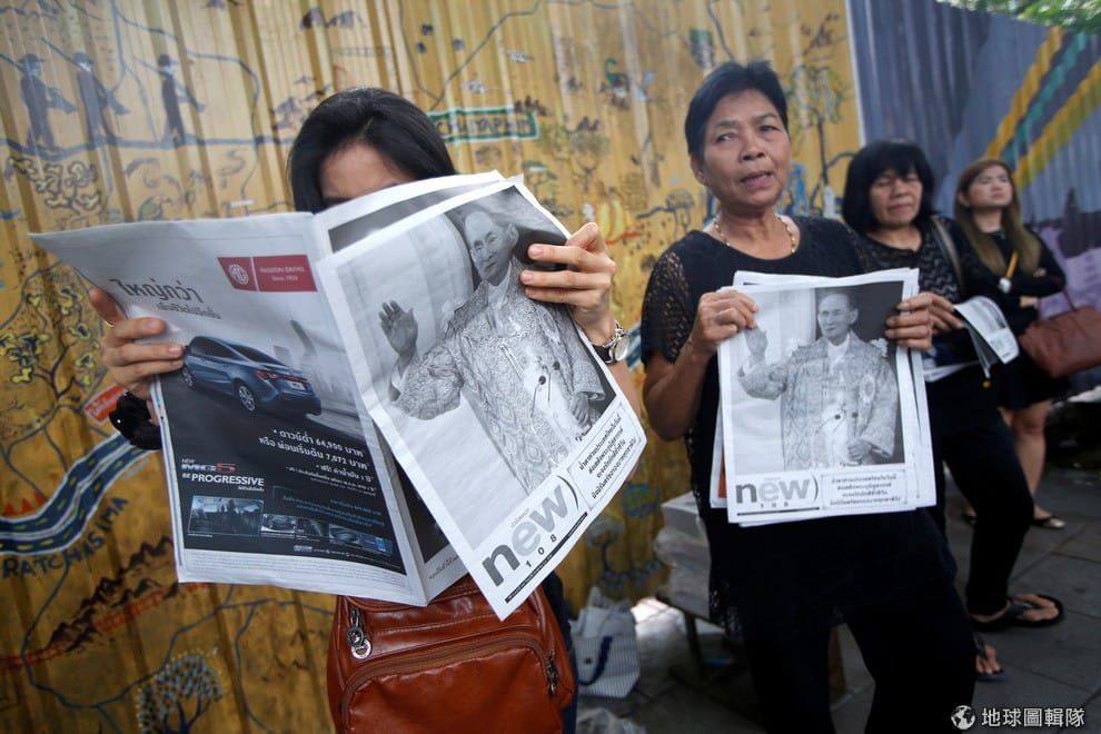 路透社泰國民眾攤開用黑白印刷,印有泰王蒲美蓬逝世消息的報紙閱讀。目前,所有泰國境內的電視頻道和CNN、BBC等衛星頻道,畫面全部切換成黑白二色。