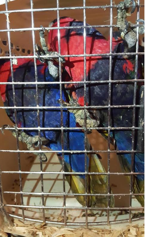 色彩鮮豔的鸚鵡們在污垢的籠子裡,已經開始自殘;沒有水,不能洗澡,又沾滿了這麼多尿,一些鳥類像化石一般,並出奇的沉默。