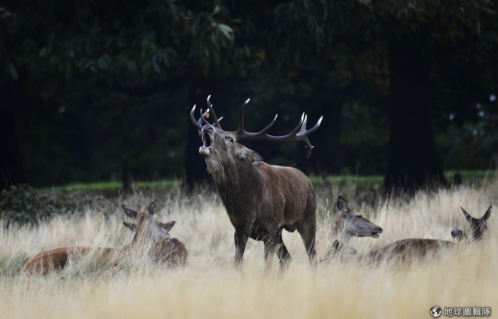在倫敦里奇蒙公園(Richmond Park)內,一頭公鹿在發情期仰天長嘯。