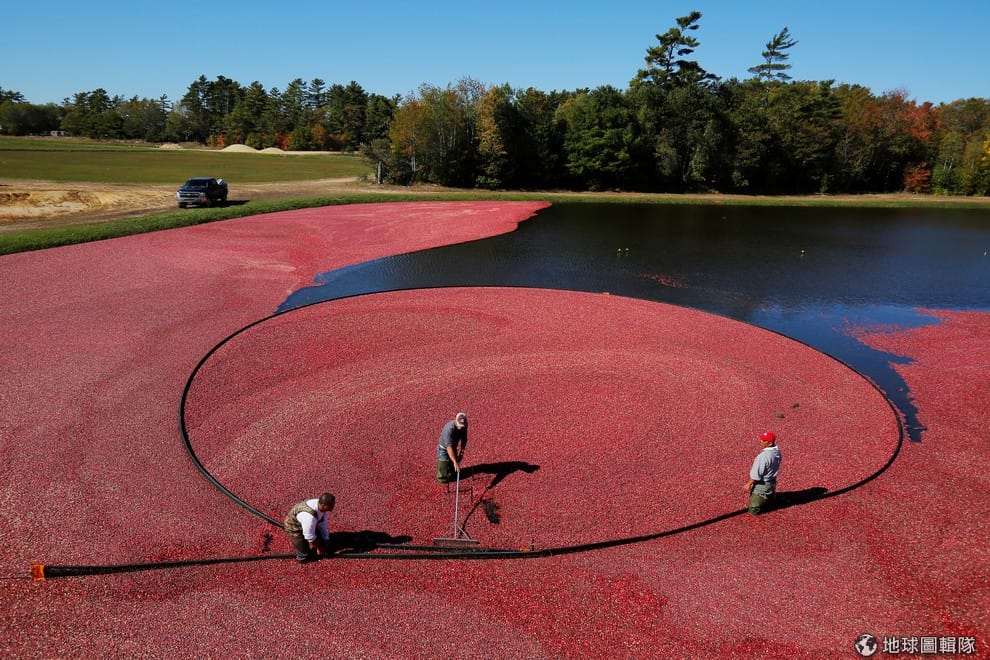 在麻州的卡佛(Carver),農人們用「水採法」(Wet Harvest)來採收蔓越莓,他們先將蔓越莓田注滿水,隨後啟動採莓車,採莓車特製的旋轉棒可以將和藤蔓相連的蔓越莓拍落水面,讓一顆顆的蔓越莓浮在水面上,形成一片紅通通的美麗莓海。