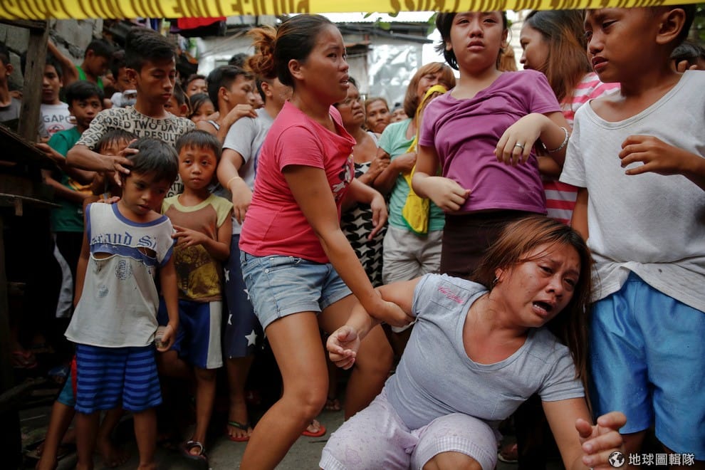一名毒犯的家人在封鎖線外哭泣,剛才在警方的逮捕行動中,該名毒犯遭槍殺。