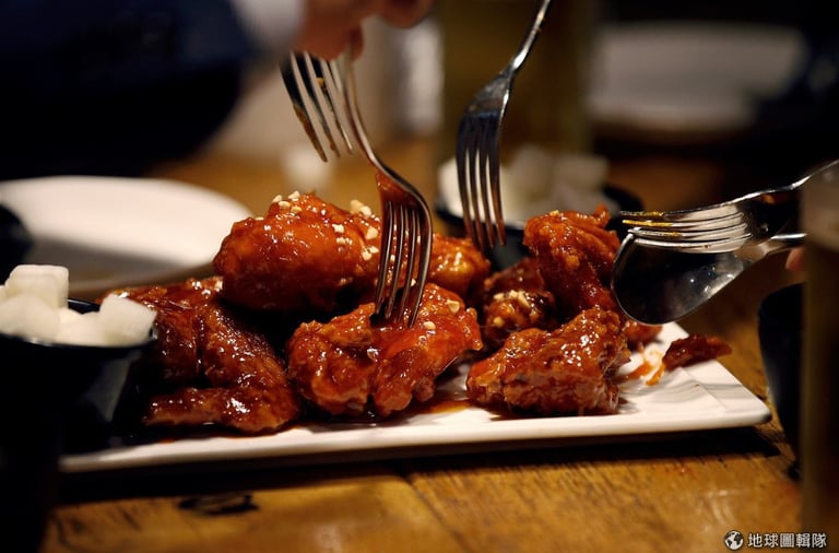 饕客們在首爾一間酒吧內,品嘗香氣襲人的韓式炸雞。