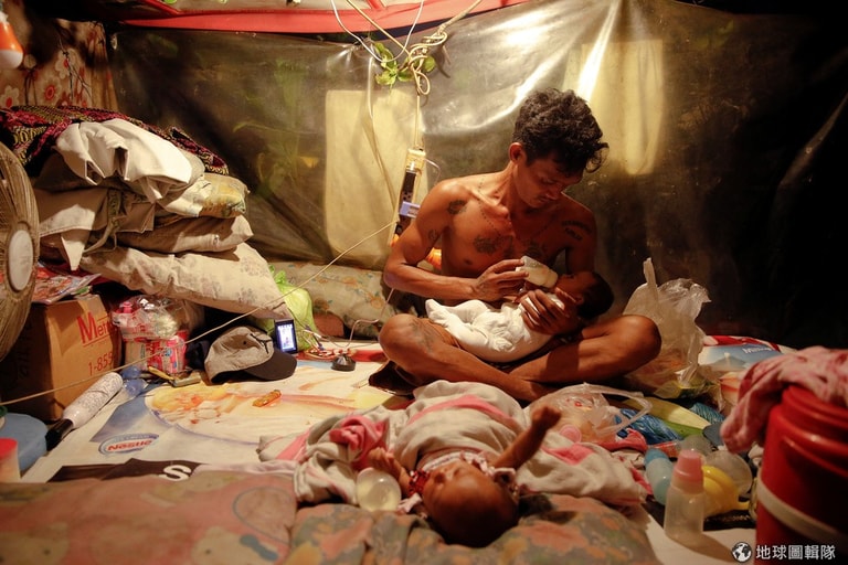 一名男子拿著奶瓶餵養懷中的小嬰兒,這裡是菲律賓當地的墓園,他們在墓園搭起簡陋的帳篷,生火起居都在這,而這座墓園埋了許多因為最近當局掃毒行動被槍殺的受害者。
