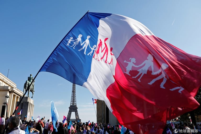 在巴黎鐵塔前的廣場,反對同性婚姻的民眾手持法國國旗,一起搖旗吶喊,此外,他們也反對人工生殖科技與代理孕母。2013年,法國同性婚姻合法化,成為了全球第 13個同性婚姻合法的國家。